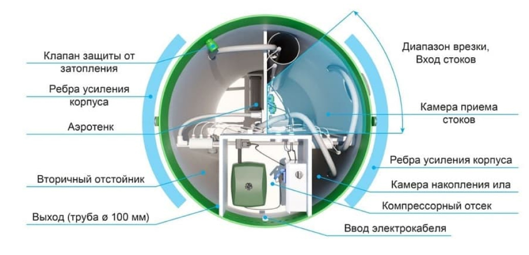 - Высокая степень очистки: до 98% благодаря многоступенчатой биологической очистке